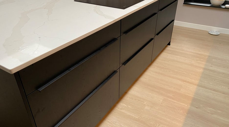 For her colour scheme, she chose the 'Structura - Nero Oak' range, which offered a subtle and contemporary feel to her kitchen. This was beautifully complemented by modern, sleek black handles that enhanced the overall aesthetic of the space.